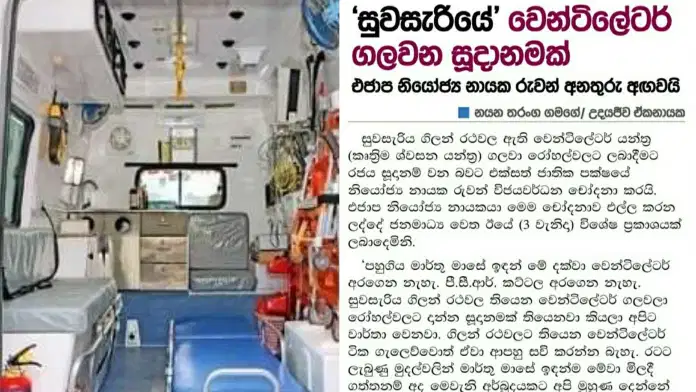 Home පුවත් සුවසැරියේ වෙන්ටිලේටර්ස් ගලවන කතාව බොරු – හර්ෂ ද සිල්වා පුවත් සුවසැරියේ වෙන්ටිලේටර්ස් ගලවන කතාව බොරු – හර්ෂ ද සිල්වා By MediaLK.com - November 6, 2020 FacebookTwitterPinterestWhatsApp සුවසැරිය ගිලන් රථ සේවයේ ඇති වෙන්ටිලේටර්ස් වත්මන් රජය විසින් ගලවා රෝහල් වෙත ලබාදීමට තීරණය කර ඇති බවට පසුගිය දිනවල පළ වූ පුවත් වාර්තා අසත්ය බව පාර්ලිමේන්තු මන්ත්රී හර්ෂ ද සිල්වා මහතා කියයි. ‘සුවසැරියේ වෙන්ටිලේටර් ගලවන සූදානමක්’ යන සිරස්තලය සහිතව එක්සත් ජාතික පක්ෂයේ උප නායක රුවන් විජයවර්ධන මහතා උපුටා දක්වමින් අදාළ පුවත වාර්තා කර තිබිණි. එක් පුවත් වාර්තාවක් පහත දැක්වෙයි. ෆේස්බුක් සටහනක් පළ කරමින් සිල්වා මහතා ප්රකාශ කළේ ගලවාගැනීමට සුවසැරියේ වෙන්ටිලේටර්ස් නොමැති බවත් සුවසැරිය ගිලන්රථ සේවයේ වෙන්ටිලේටර්ස් ගලවාගෙන යාමට සූදානමක් තිබෙනවා යැයි ප්රචාරය කරන්නේ ඒ ගැන නොදන්නා පිරිසක් බවත්ය. පසුව මේ සම්බන්ධයෙන් කළ විමසීමකදී ද පාර්ලිමේන්තු මන්ත්රී හර්ෂ ද සිල්වා මහතා නැවතත් පැවසූවේ එලෙස ගලවා ගැනීමට වෙන්ටිලේටර්ස් සුවසැරියේ නොමැති බවයි. RELATED ARTICLESMORE FROM AUTHOR පුවත් වැලිගම වෙඩික්කරු අල්ලයි – මෙහෙයුමට කිත්සිරිගේ සම්බන්ධයක් නැතිලු පුවත් පෙම්වතා පණපිටින් පිළිස්සූ තැන හැදුණු කඳුළු බිත්තියේ කඳුළු කතාව පරිසරය රක්ෂිත නම් කර දින 73ක් – ගැසට් තවම නෑ LEAVE A REPLY Cancel reply Please enter your comment! Please enter your name here You have entered an incorrect email address! Please enter your email address here Save my name, email, and website in this browser for the next time I comment.
