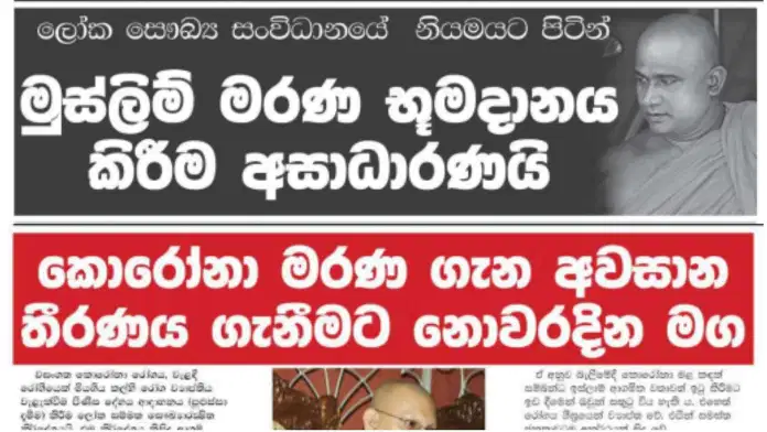 “කොරෝනා ආසාදනයෙන් මිය යන සියලු දෙනාගේ දේහයන් ආදාහනය කරන ලෙසට ලෝක සෞඛ්‍ය සංවිධානය ප්‍රකාශ කර තිබියදීත් මිය යන මුස්ලිම් පුද්ගලයන්ගේ දේහ භුමදානය කිරීමට ප්‍රයන්ත දැරීම බලවත් ආසාධාරණයක් බව සිංහල රාවය ජාතික සංවිධානයේ නායක හිටපු පාර්ලිමේන්තු මන්ත්‍රී පූජ්‍ය අක්මීමන දයාරත්න හිමියෝ පැවසූහ.”